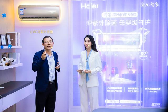 來到智慧臥室場景中,一位父親也分享了自己的帶娃經驗。"小孩子免疫力差,空氣除菌問題不能忽視。海爾雷神者空調不僅有UVC除菌模塊可以給空氣除菌,內置的56度C除菌自清潔還能保證空調自身潔凈,除菌率達99%。"