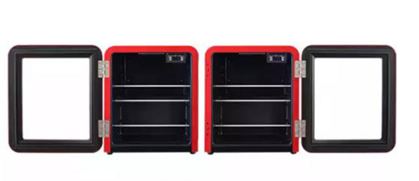先說一下兩款產品的外觀。哈士奇(HCK)的SC-46RGE是可透視玻璃門的,用全球化妝品冰箱最新透視展示技術,所有存放的化妝品隨時清晰可見,全網獨家。三層鋼化玻璃加特殊鍍膜,有效抵擋紫外線。,而且上面有楓葉款紀念標志作為裝飾,很美觀,第一眼看上去比較通透、高端。繽兔的HJS-G-13L1是內部不可視的,就難免落于常規了。從外部材質上來說,繽兔的這款冰箱是全塑料的材質,看上去質感就沒有那么好,顯得有點低端。而哈士奇(HCK)的這款是全金屬的箱體,這種高明度的全金屬就比較高端。從線條流暢度上來講,繽兔的這款產品雖然也是圓弧設計,但是弧度不自然,配上長方體的塑料箱體顯得有些笨重。HCK哈士奇的這款產品是純手工打磨的80°經典弧形外觀,流暢自然,更符合它復古的氣質。