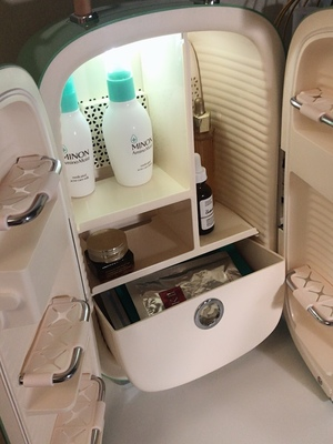 另外從存放空間上來講,繽兔的這款冰箱容量是13L的,存放功能區是固定的,我試著放了一些面膜和幾瓶護膚品,空間有些小,特別是放一些瓶瓶罐罐十分不方便。HCK哈士奇的這款是42L的,足足是繽兔冰箱的3倍有余,容量真的非常大。而且它內部的儲存層架還可以自由調節,不像繽兔冰箱的固定式層架,放了兩套水乳,五十幾張面膜,幾管口紅,還游刃有余。而且HCK哈士奇的這款產品有個特別之處,就是冰箱里有個冷光小夜燈,即使晚上也能輕松護膚了。