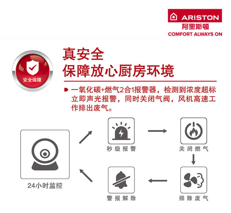 一款燃氣熱水器在提供優質的使用感受之外,使用安全性同樣是一個不容忽視的問題,尤其在冬天就更顯重要。眾所周知,當室內通風不暢,熱水器出現燃氣燃燒不充分時,極易產生一氧化碳泄漏,進而埋下安全隱患。而在冬季,室內很多時候都處于門窗緊閉的狀態,如果家中出現設備管道老化、燃氣點火不成功甚至火焰被風吹滅等情況時,極易形成安全隱患。對此狀況,阿里斯頓全新IPT安捷零冷水燃氣熱水器將安全防范“極限”升級,推出了“一氧化碳+燃氣2合1報警系統”安全防護組合拳,當檢測到空氣中一氧化碳/燃氣濃度超標時,會立刻發出聲光報警,同時關閉氣閥,風機高速工作排出有害氣體,嚴守居家安全百分百。