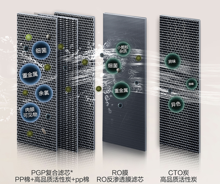 其中,PGP復合濾芯,主要是由PP棉+活性炭+PP棉組成,能夠有效過濾泥沙、雜質、余氯等大顆粒污染物,有效降低水中的固體和渾濁度;RO反滲透膜可以過濾重金屬、細菌、小顆粒雜質等;CTO活性炭濾芯,可以改善純水的口感和異味等。三重濾芯一起工作,可以在保證水質的情況下,盡可能地提高水的口感。