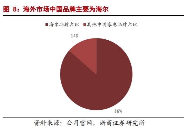 海爾智家是海外自主創(chuàng)牌的先行者,已經(jīng)基本完成了前期創(chuàng)牌投入,隨著品牌布局逐漸落子完畢,其已經(jīng)打開了高盈利的上升通道。作為先行者,海爾智家的布局領(lǐng)先了二十多年,在數(shù)據(jù)上也充分體現(xiàn)了這一點(diǎn):在海外市場所有中國品牌中海爾的份額高達(dá)86.5%。