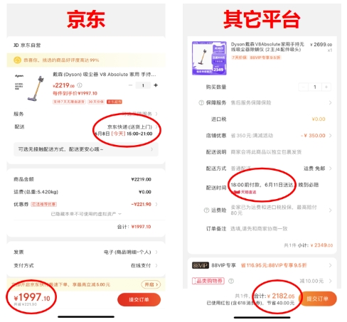 首先對比的是家務好幫手——戴森吸塵器V8 Absolute,這款功能強大的手持吸塵器在京東使用9折消費券后,價格僅需1997元,相比日常價立減220元,其它平臺則有小幅的降價,相比之下,京東家電優惠力度更勝一籌。不僅如此,京東618期間,物流配送也是相當快速,在京準達、211準時達等服務加持下,最快次日就能收到貨。