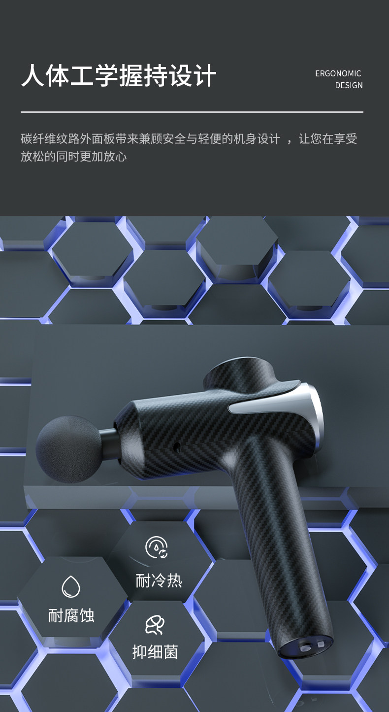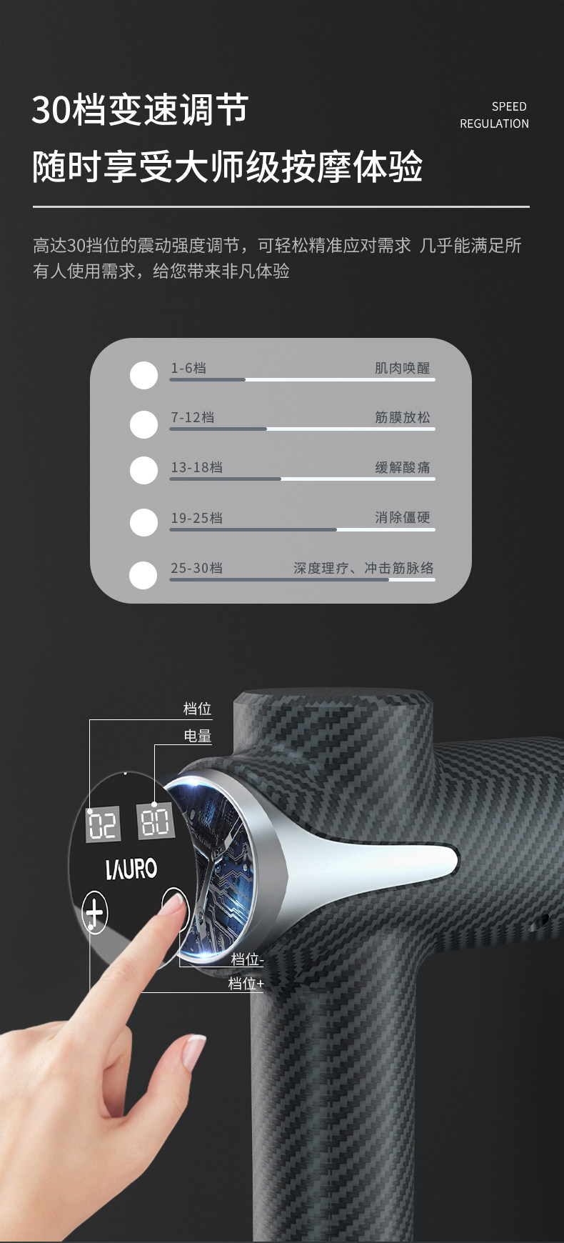 LAURO Q5筋膜槍充分考量使用者手握姿態,采用人體工學握持設計、碳纖維紋路,兼顧安全與輕便,且采用長效儲能鋰電池,持久輸出動力,無需為頻繁充電而困擾,充滿一次電,可滿足一個月的使用,自在隨心,隨時隨地暢享無憂體驗!
