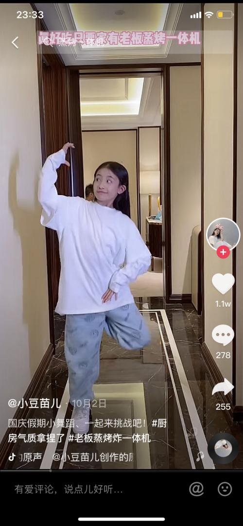 此外,在主流短視頻社交平臺抖音上,老板電器同步發起了了#廚房氣質拿捏了#話題任務挑戰賽,該話題一經上線,其《蒸烤舞》中“蒸好吃、烤好吃,蒸烤混動真好吃,只要家有老板蒸烤一體機,蒸蒸烤烤都好吃!”的洗腦曲調與歌詞及魔性舞蹈均深受網友們的喜愛,甚至吸引到了許多來自不同領域的頭部KOL及KOC參與打卡,如有百萬粉絲的舞蹈紅人“小豆苗兒”、情侶KOL柴三歲等等,結合自己的不同風格,花式演繹了這首洗腦神曲。