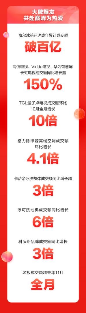 與此同時,各大品牌也在刷新著銷售記錄。海爾冰箱已達成年累計成交額破百億;海信電視、Vidda電視、華為智慧屏、長虹電視成交額同比增長超150%;TCL量子點電視成交額環比10月全月增長10倍;格力除甲醛高端空調成交額環比增長4.1倍;卡薩帝冰洗整體成交額同比增長超3倍;添可洗地機成交額同比增長6倍;科沃斯品牌成交額同比增長3倍;老板成交額超去年11月全月。各大家電品牌代表均表示,在和京東家電的深度合作中,雙方一直堅持以用戶需求為核心,共建、共創市場,一路取得了良好的成績,相信明年的11.11會再創奇跡。