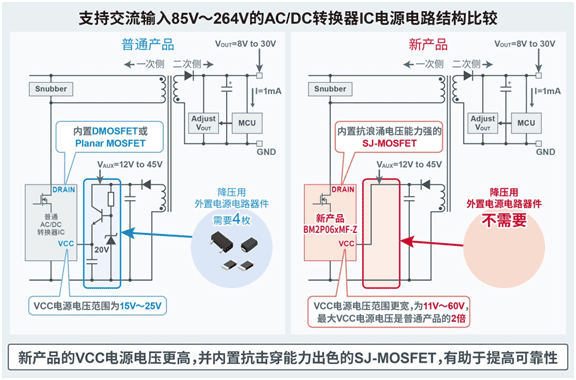 不僅如此,在內置的功率半導體中,還采用了具有很強抗浪涌電壓能力的SJ-MOSFET(抗擊穿能力指標——雪崩耐量比普通產品中內置的DMOSFET和Planar MOSFET高30倍以上),降低了半導體的故障風險,因此有助于提高電源系統的可靠性。