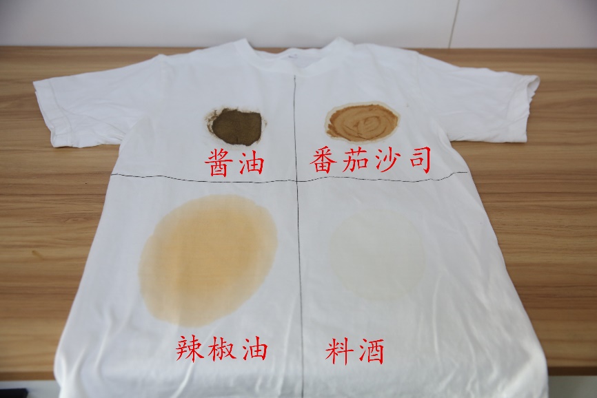 首先我們用醬油、番茄沙司、辣椒油和料酒將衣物進(jìn)行污染。懸掛靜置15小時(shí)后備用。
