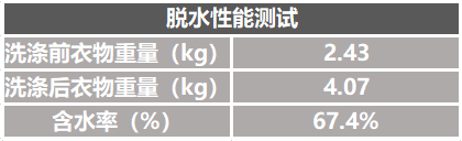 測試時(shí),脫水性能我們用衣物脫水后的含水率來表示。含水率越高,表示衣物中的水含量越高,但并不表示脫水性能越好或者越不好。這是因?yàn)楹逝c衣物的褶皺程度有關(guān)系,含水率越低,洗后衣物褶皺越多。那這臺(tái)洗衣機(jī)的測試效果如何呢?結(jié)果如下:
