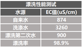 漂洗性能測試的是洗滌劑是否被漂洗干凈,用漂洗率來表示,漂洗率越高表示洗滌劑被漂洗得越干凈。測試時(shí),我們分別測量自來水、洗滌水和最后一次漂洗水的EC值,計(jì)算得出漂洗率,具體結(jié)果如下: