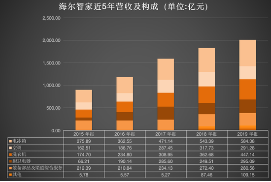 ??與其他家電龍頭企業相比,海爾智家堅持智慧家庭引領的戰略方向,正全面布局物聯網生態。2019年空調收入291.12億元,同比減少8.3%;電冰箱收入584.37億,同比增長7.5%;廚電收入295.09億元,同比增長18.3%;水家電收入96.24億元,同比增長5.8%;洗衣機收入447.14億元,同比增長23.3%;裝備部品及渠道綜合服務收入280.6億元,同比增長4.5%。