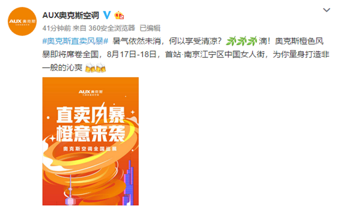 今日,奧克斯空調(diào)官方微博發(fā)布了一張主題為“直賣風(fēng)暴 橙意來襲”的海報(bào),為即將開啟的“奧克斯空調(diào)直賣風(fēng)暴快閃巡展”首站活動(dòng)進(jìn)行預(yù)熱。