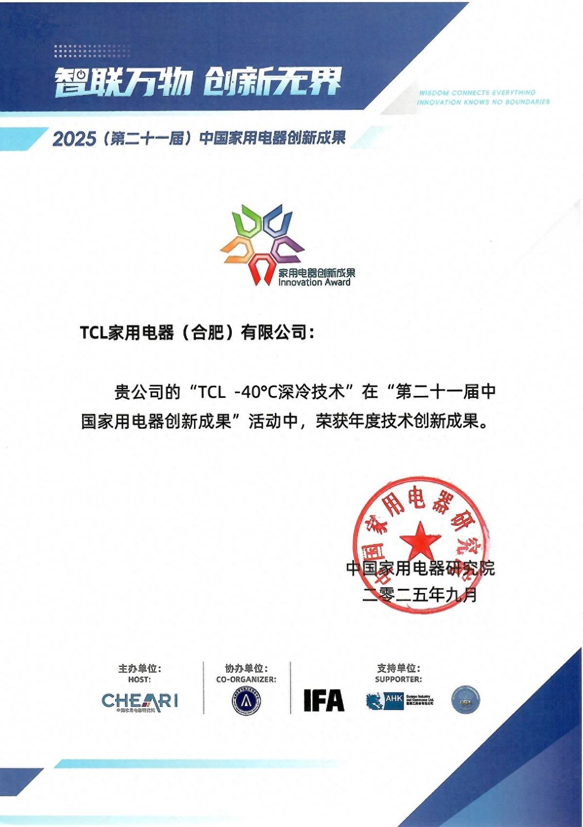 健康用冰標(biāo)準(zhǔn) TCL-40℃深冷技術(shù)獲得“年度技術(shù)創(chuàng)新”成果