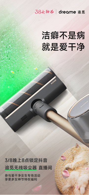 追覓科技不僅希望用科技解放雙手,也愿大家能夠過上勇敢追夢,輕松自在的生活。國際婦女節在即,追覓科技在3月8日晚20:00開啟“追覓無線吸塵器”抖音直播間專場活動,以“潔癖不是病 就是愛干凈”為主題,邀