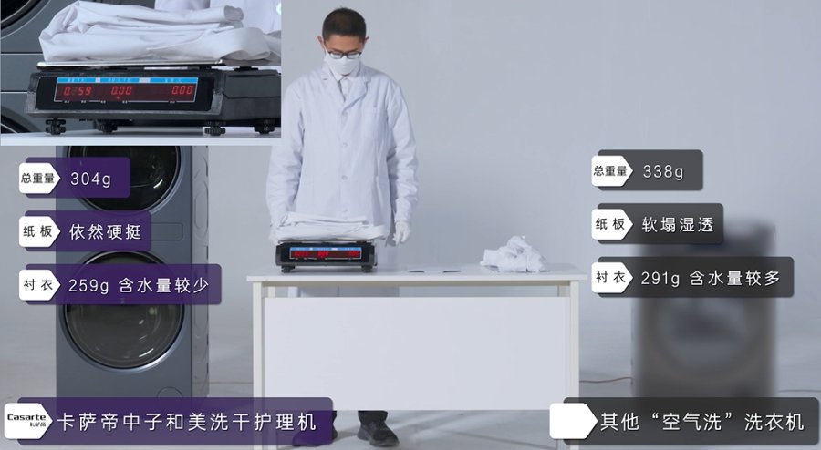 11月23日,卡薩帝發布一則“空氣洗”對比視頻。將兩件同款夾著襯紙的襯衣分別放入卡薩帝“空氣洗”和另外一臺“空氣洗”中護理,結果顯示前者平整順滑,后者卻仍有褶皺。重量對比來看,前者和剛放進去時重量一樣