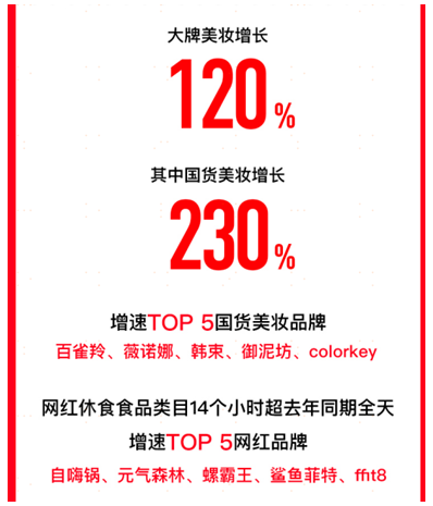 今年雙十一精致生活消費趨勢更加明顯。OLED&QLED銷量18小時內(nèi)同比增長79.7%。大牌美妝19小時內(nèi)銷量增長120%,網(wǎng)紅休閑食品產(chǎn)品14小時銷量超全年同期全天,智能生活電器增長320%。