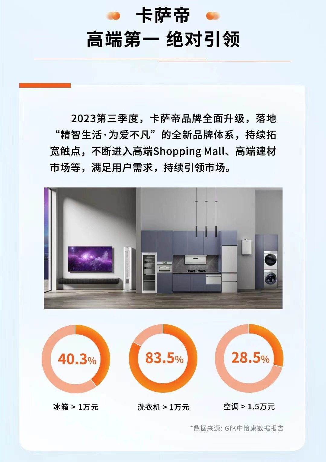 如今,這一局面被卡薩帝打破了。最新數據顯示,卡薩帝既是高端TOP1,又是行業TOP2。今年前三季度,卡薩帝冰箱、洗衣機在1W+市場份額分別為40.3%、83.5%,空調在1.5W+市場份額為28.5