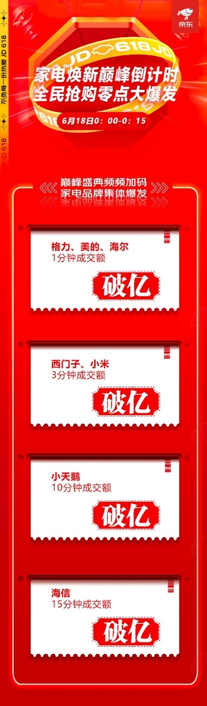 6月18日,“京東618,18周年慶”進入最后的高潮階段。國內外各大家電品牌的所有家電品類全面爆發。開場僅1分鐘,格力、美的、海爾成交額均破億;西門子、小米3分鐘破億;小天鵝10分鐘破億;海信15分鐘