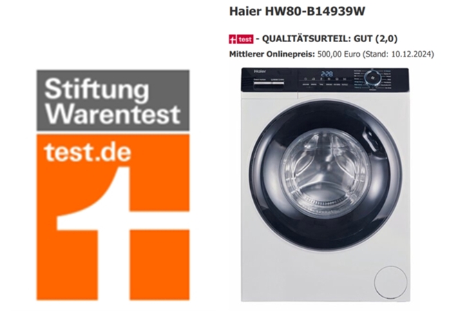 10月,德國權威測評機構Stiftung Warentest(以下簡寫Stiwa)公布2025年度洗衣機測評結果,海爾I-Pro 5系列洗衣機獲得總分2.1 GUT(好)的成績,成為本次測評中唯一獲G